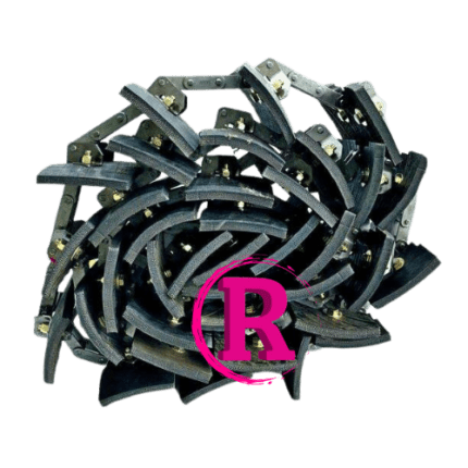 Complete aftermarket elevator chain with bolted paddles and 19 attachments for returns (tailings) elevator on JD combines.