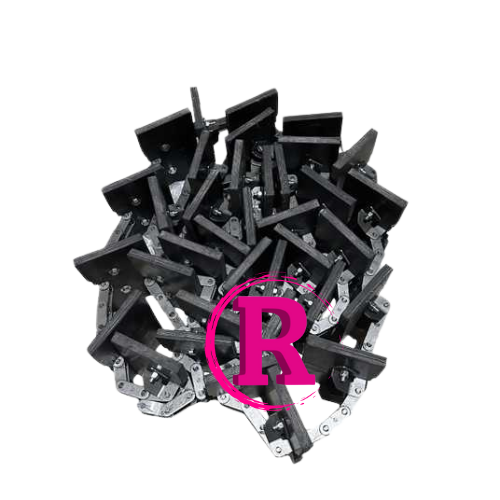 Complete aftermarket elevator chain with bolted paddles and 19 attachments for returns (tailings) elevator on JD combines.